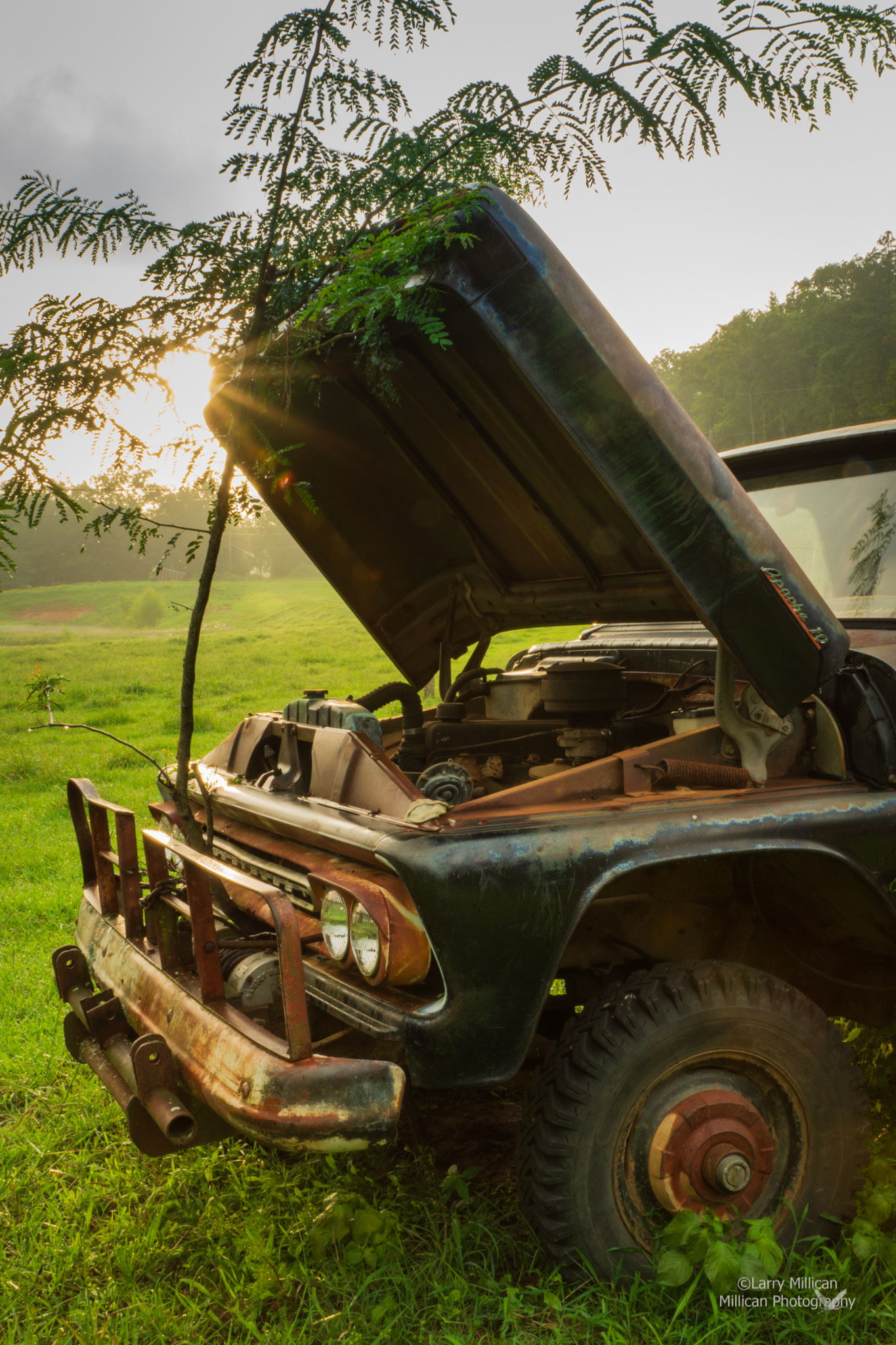It had been parked and left to the elements: there was a sapling tree growing between the bumper and the grill, and grass and wildflowers were growing up around the fenders.