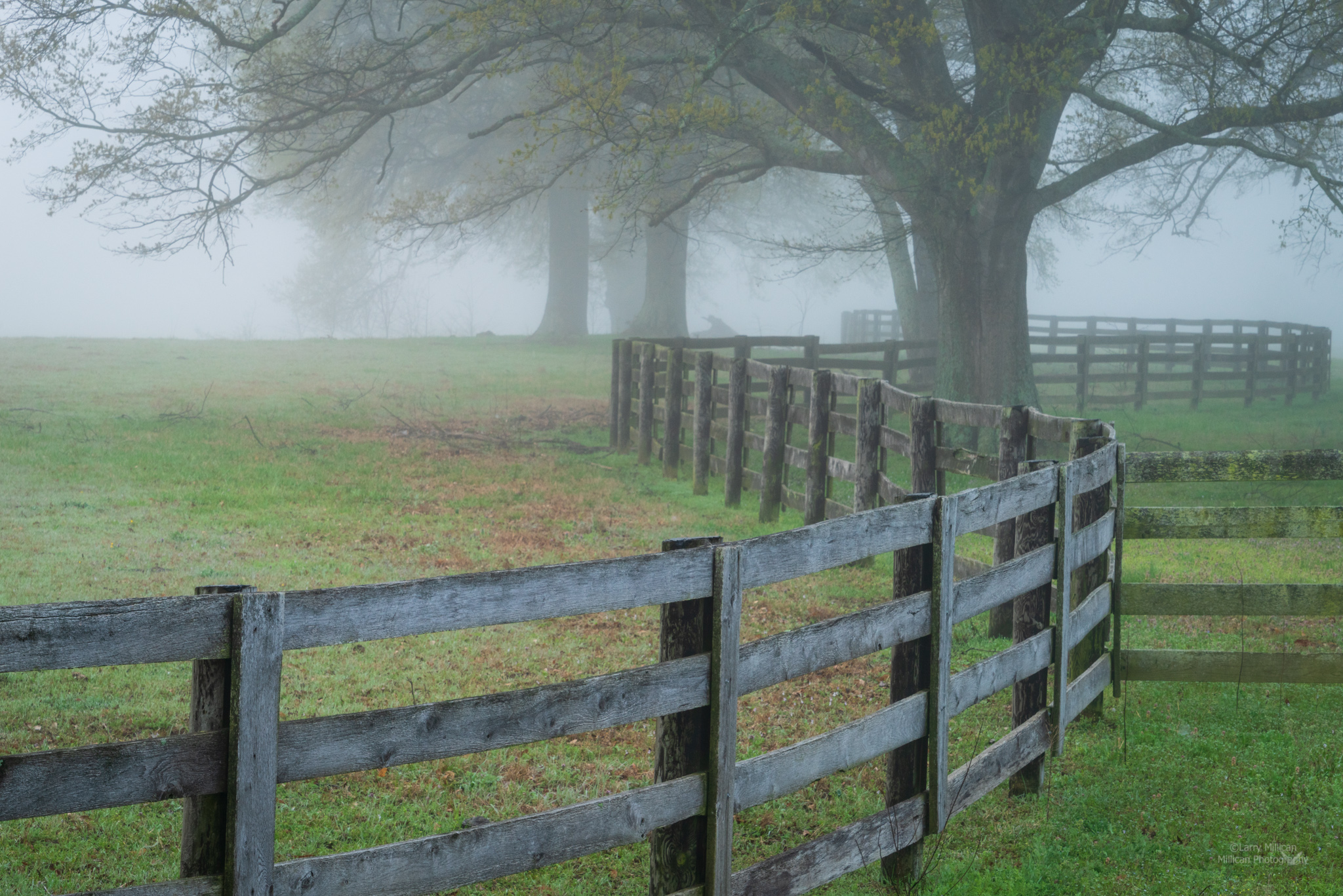 In April, I drove to Hot Springs, Arkansas to Garvan Woodland Gardens.  The morning fog was thick, and I saw several scenes that would have made good photographs.  Finally, I drove by this ranch, and knew I had to stop to make the photograph, even though the highway was busy with people hurrying on their way to work.  That afternoon, on the return drive, the fog was gone – and so was the photograph.  Moral:  When you see the photograph – make the photograph!