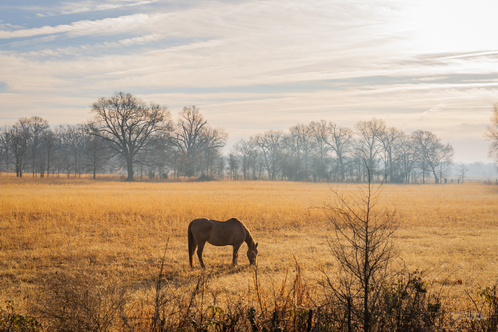 A few days later, I visited Petit Jean State Park.  On the drive there, I saw this morning light, and this field, and the red horse.  I drove on a little ways, then went back, parked on the shoulder of the highway, and made a few photographs before the light was gone…